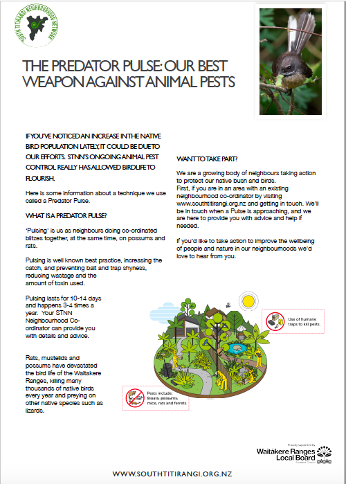 South Titirangi Neighbourhood Network (STNN) is a network of local neighbours working together to help create a pest and weed free South Titirangi Peninsula.